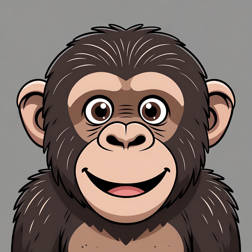 animal, big eyes, brown fur, cartoon animal, chimp, chimp face, clipart, cute chimp, fluffy fur, gray background, happy face, illustration, isolated background, primate, smiling chimpanzee, cartoon chimpanzee