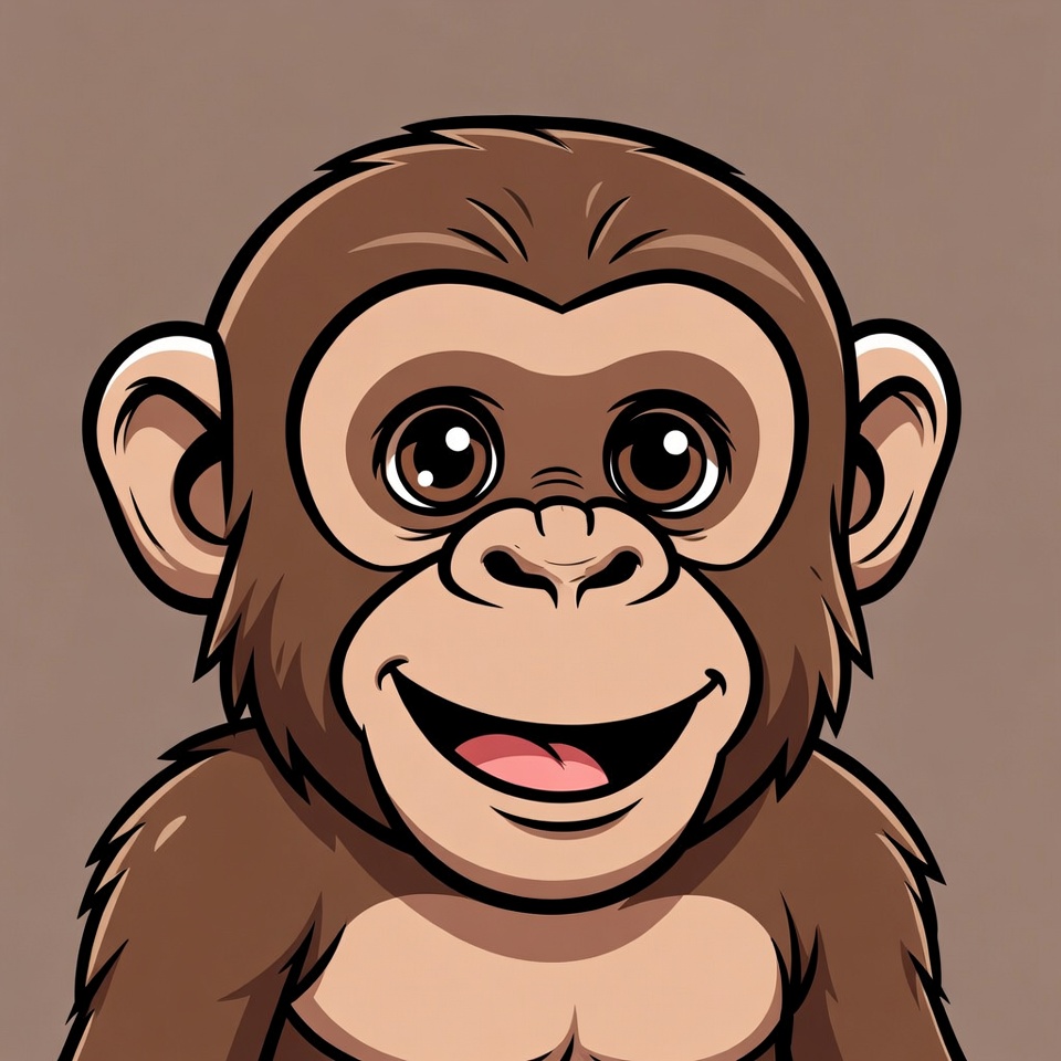 A cheerful cartoon monkey with brown fur and large expressive eyes smiles widely on a plain background. The illustration features bold black outlines, shiny highlights on the eyes, and a visible tongue. It has fluffy fur around the face and chest.