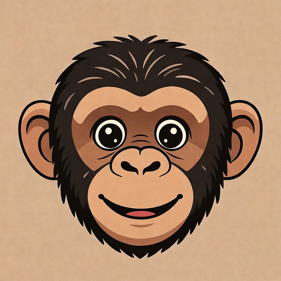 A cartoon illustration of a chimpanzee with big expressive eyes and a wide smile. The chimp has fluffy dark brown fur around its head and large rounded ears. It is depicted on a plain beige background.