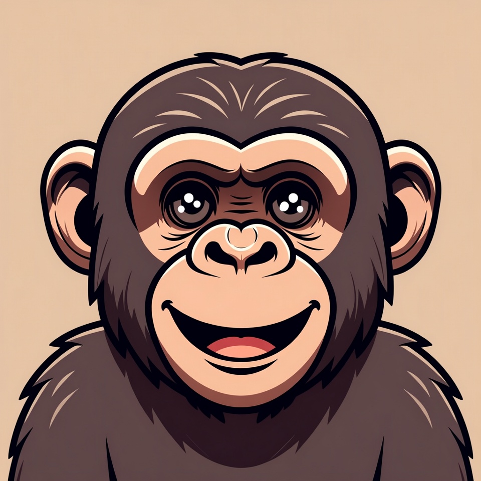 A cute cartoon chimpanzee with big shiny eyes and a wide smile faces forward. It has dark brown fur, prominent ears, and a pink mouth. The illustration is set against a plain beige background.