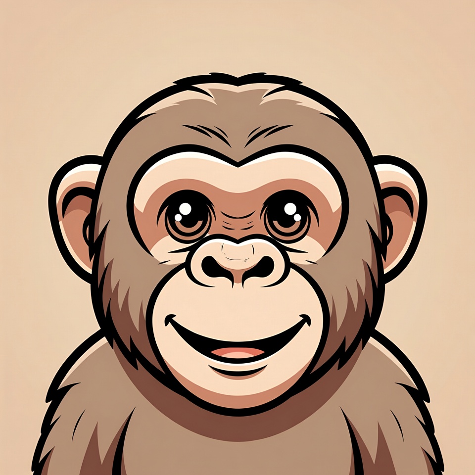 A cute cartoon monkey with brown fur smiles happily on a beige background. It has large expressive eyes, rounded ears, and a wide grin showing its teeth. The illustration features bold outlines and a friendly, playful appearance.