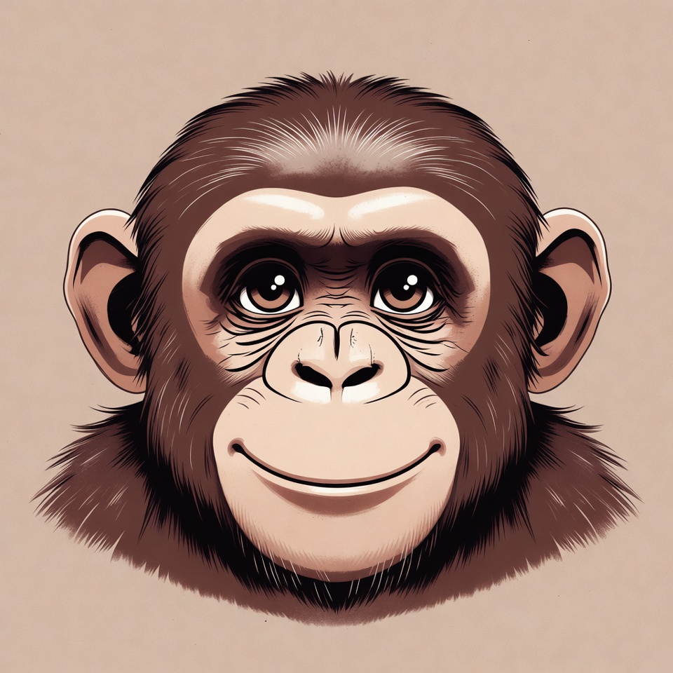 A cartoon chimpanzee with brown fur and large expressive eyes smiles happily on a beige background. The illustration features detailed facial features including prominent ears and a wide grin. It is a close-up portrait style with smooth vector lines.