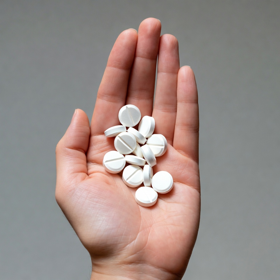 Hand holding white pills
