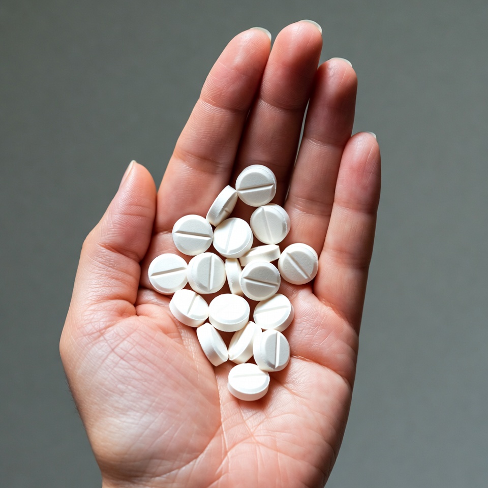 A woman's hand holds a pile of white round pills in her palm. The pills are oval-shaped with a split line down the center. The hand is positioned against a plain gray background.