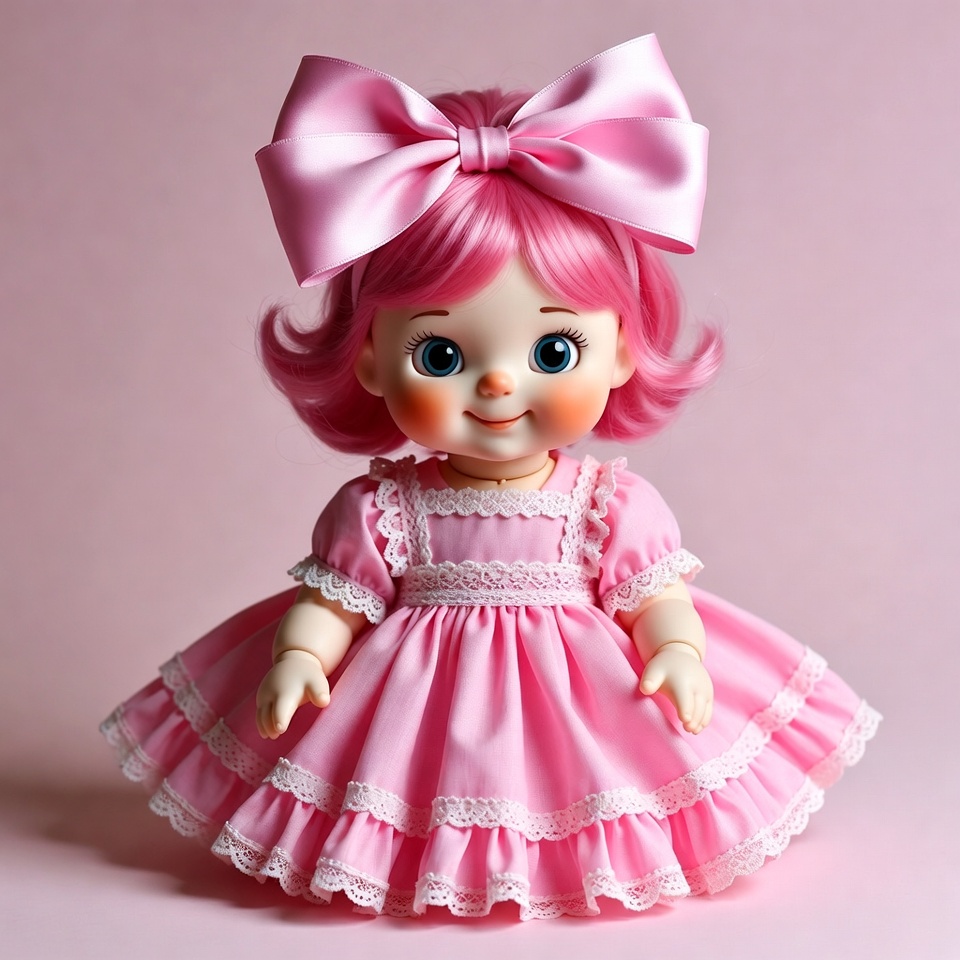 A cute doll girl with pink curly hair and large sparkling eyes wears a frilly pink dress with lace trim. She has a massive pink bow on her head and sits posed on a plain pink background. Her outfit features puffed sleeves and layered ruffles.