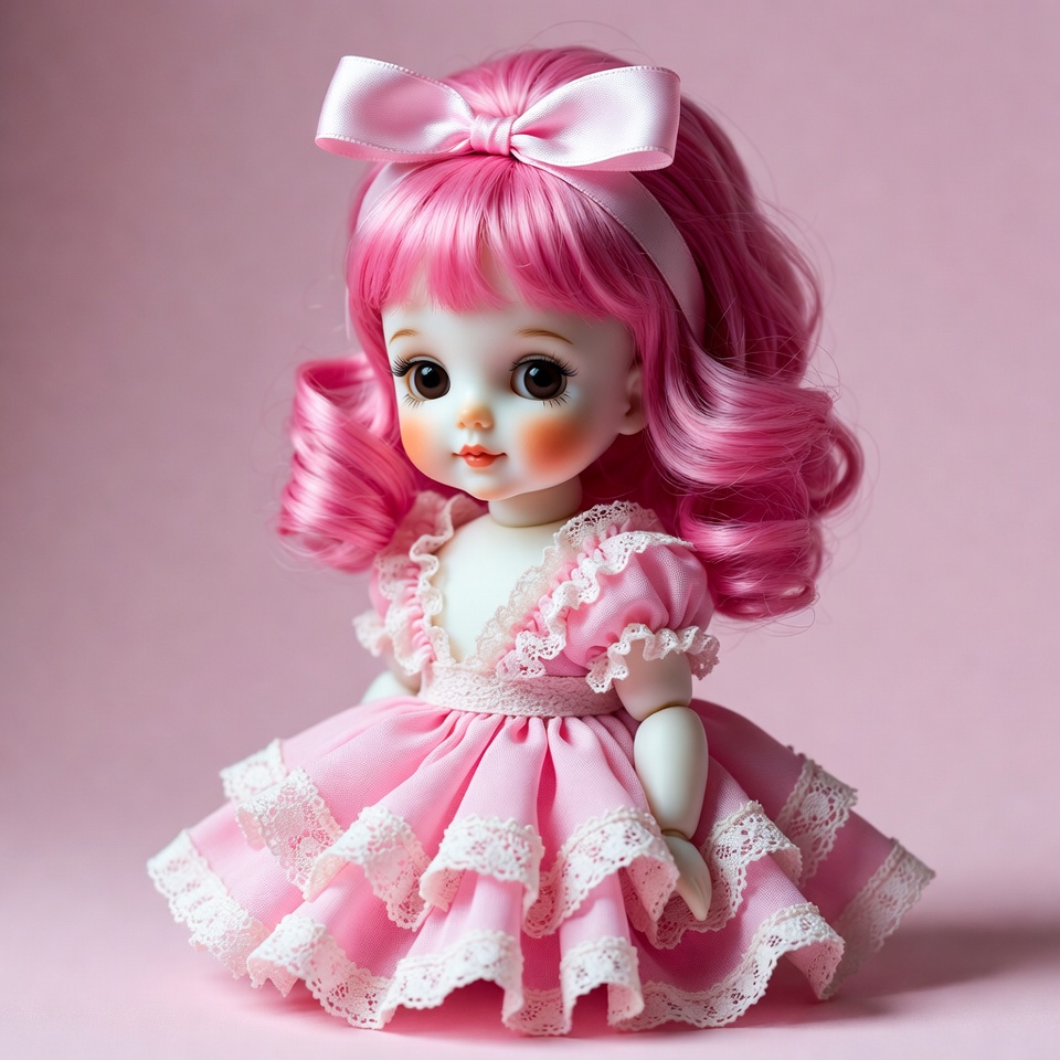 A cute ball-jointed doll with long pink curly hair and a large pink bow sits wearing a frilly pink dress with lace trim and puffed sleeves. Her large expressive eyes and subtle blush give her a doll-like charm. She is posed against a solid pink background.