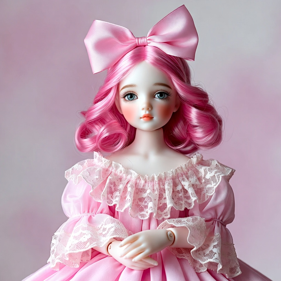 Asian, BJD doll, blue eyes, curly hair, cute doll, doll face, female, frilly dress, illustration, isolated background, lace dress, large bow, pink background, pink bow, pink dress, pink hair, porcelain doll, ball-jointed doll