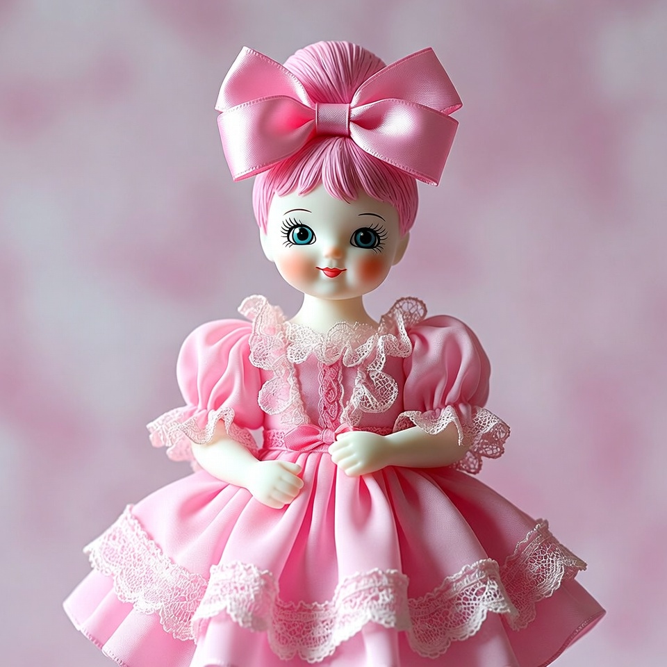 A cute doll with pink hair styled in a high bun topped by a large pink bow stands against a pink background. She wears a frilly pink dress with puffed sleeves, lace trims, and multiple layers of ruffles. Her large expressive eyes and smiling face give her a cheerful anime-inspired appearance.