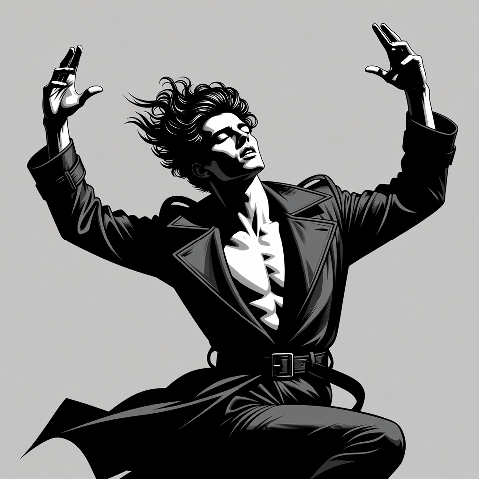 A stylish young man with windswept curly hair raises both arms dramatically while wearing an open black trench coat that reveals his bare chest. The illustration is rendered in black and white line art style against a plain gray background. His coat billows as if caught in the wind, emphasizing a dynamic pose.