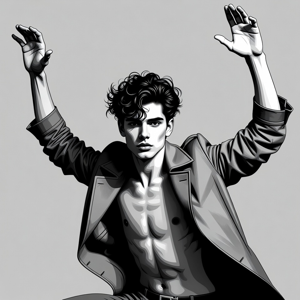 A handsome young man with curly dark hair stands with arms raised high, hands open. He wears an open trench coat revealing his muscular bare chest and defined abs. The black and white illustration is set against a plain gray background.