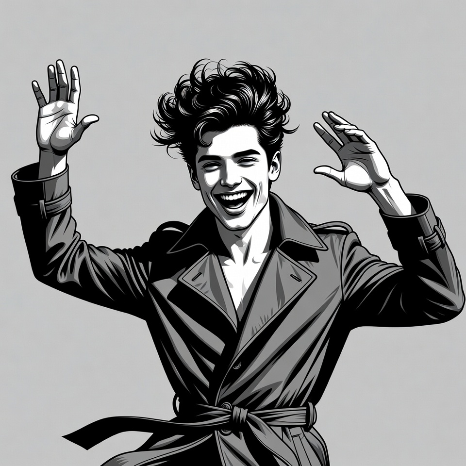A young man with curly hair laughs joyfully while raising both hands in the air. He wears an open black trench coat with a belt, standing against a plain gray background. The image is a detailed black and white illustration.