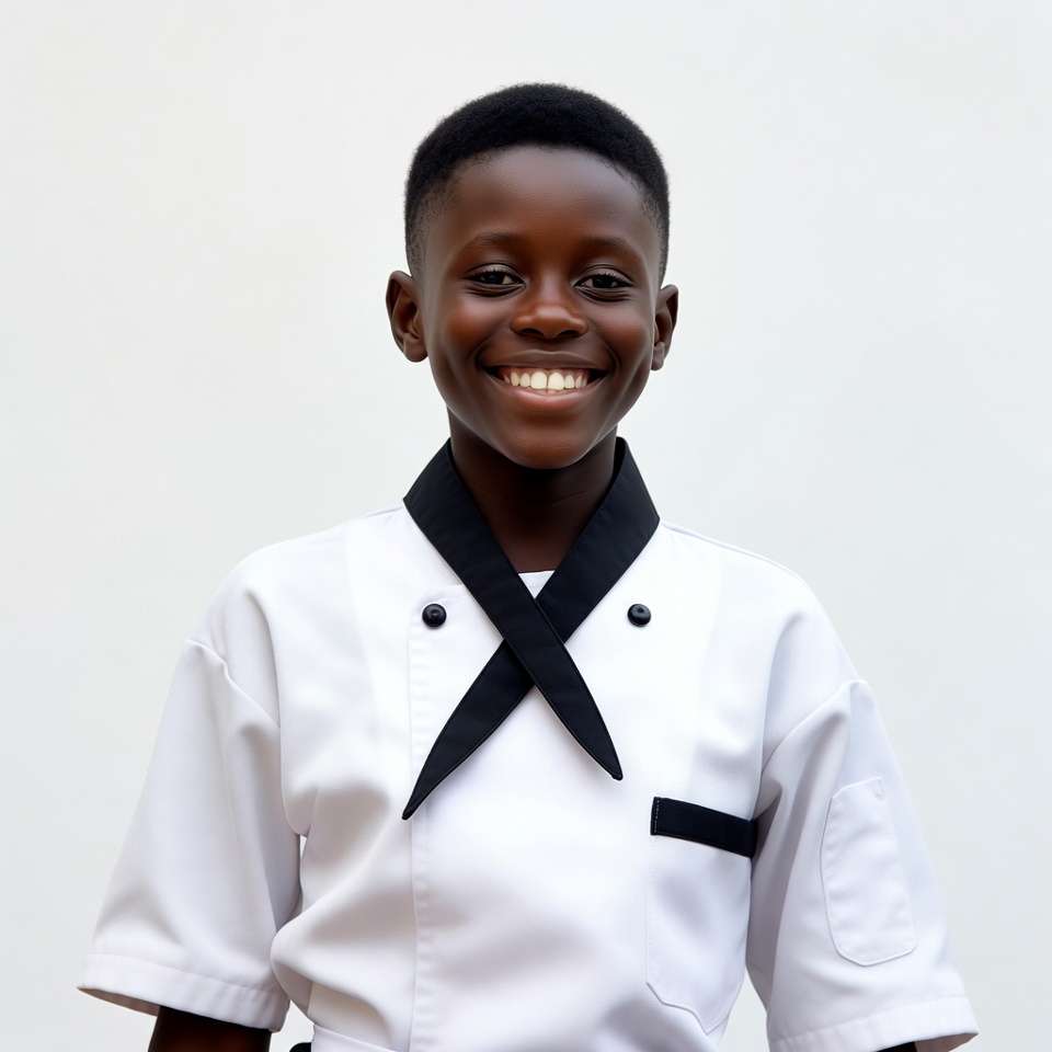 A young African boy with short black hair smiles happily at the camera. He wears a white chef jacket with black neckerchief and trim, posed against a plain white background. The uniform features buttons and short sleeves.