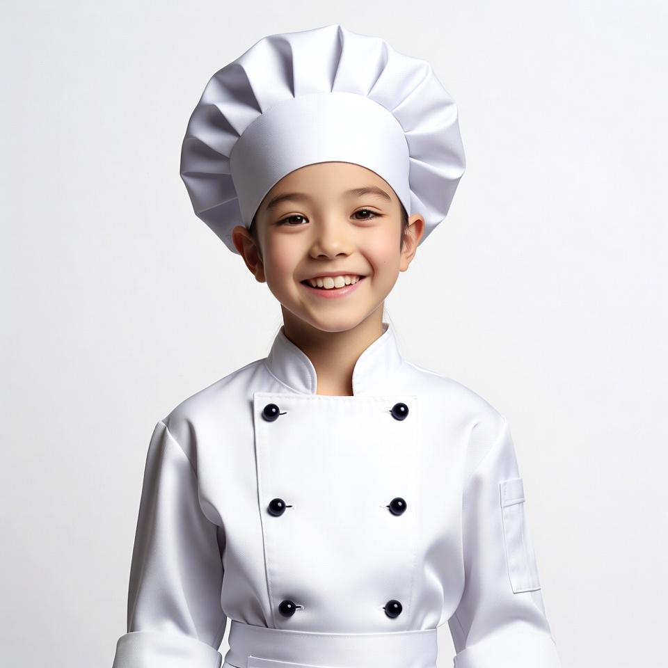 A young Asian boy with short black hair smiles happily at the camera while wearing a white chef's hat and matching chef's jacket with black buttons. He stands confidently against a plain white background. The uniform features a collared shirt design typical of professional chef attire.