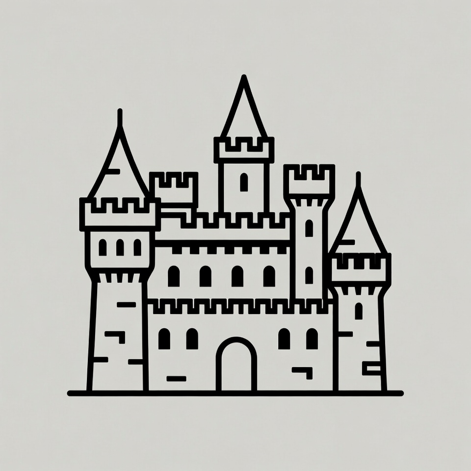 A detailed black line drawing of a grand medieval castle with multiple tall towers and spires. The castle features arched windows, battlements, and a large central entrance on an isolated background. The illustration is rendered in a simple outline style.