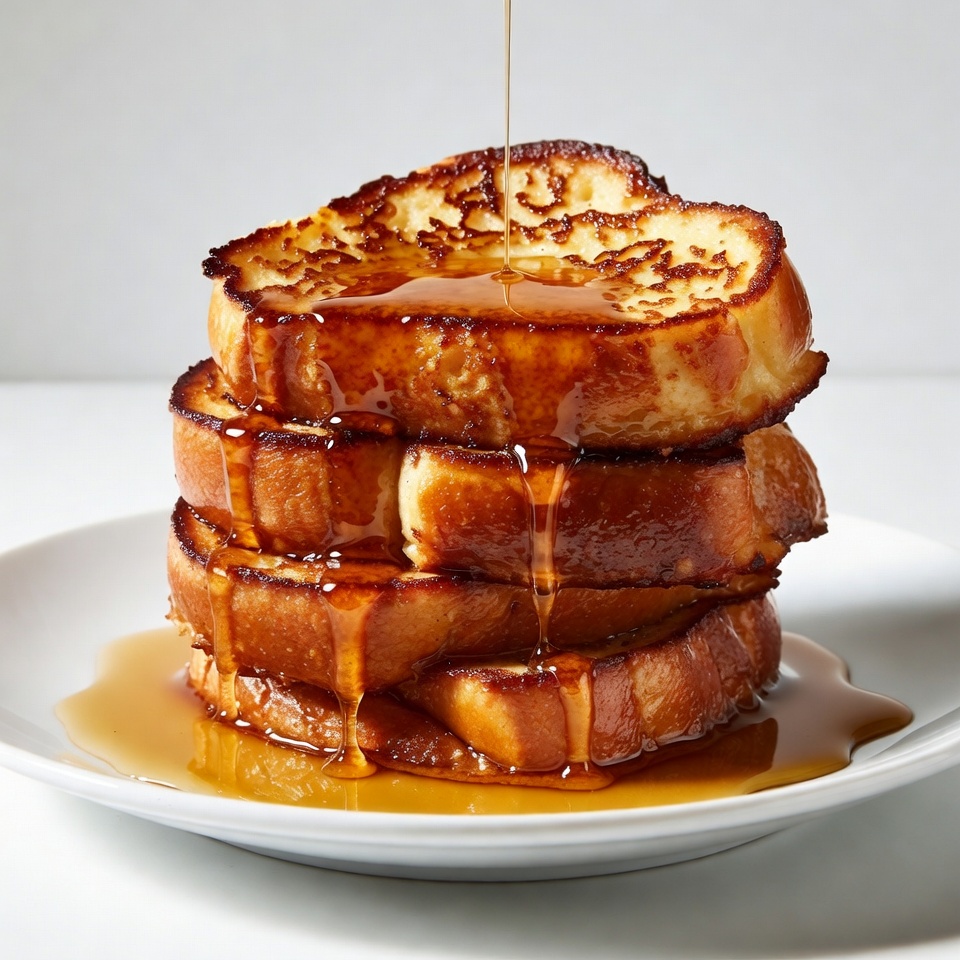 A tall stack of four golden French toast slices sits on a white plate. Maple syrup pours generously over the top, cascading down the sides in thick streams. The dish is presented on a plain white surface with a subtle syrup puddle underneath.