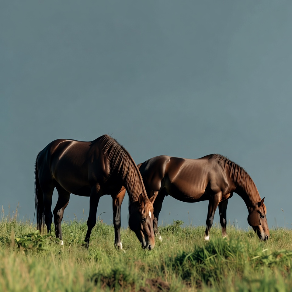 animals, bay horses, blue sky, brown horses, eating grass, equine, farm animals, field, grass, grazing, green grass, livestock, meadow, nature, outdoors, pasture, sky, two horses, horses