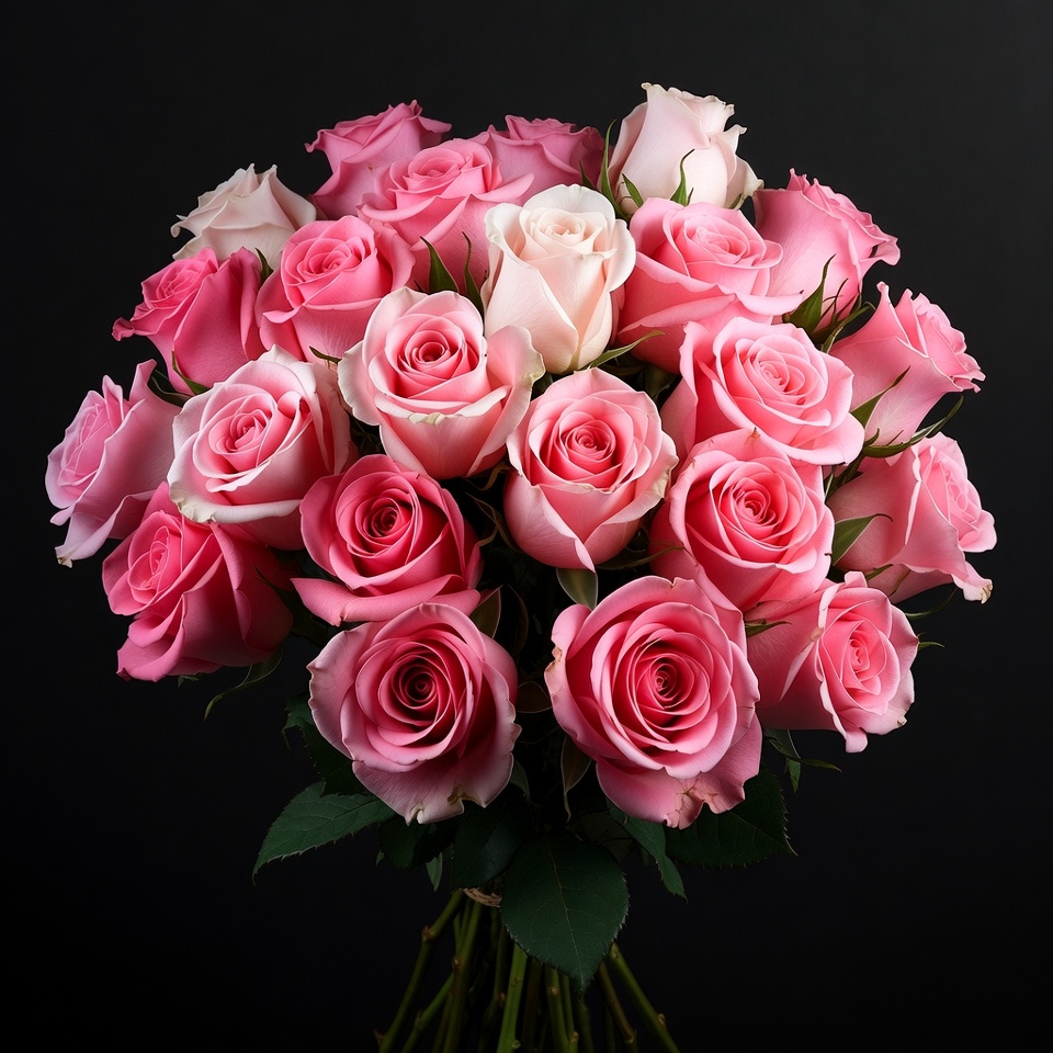 black background, bouquet, floral arrangement, flower bouquet, flowers, green leaves, isolated background, pink flowers, pink roses, rose bouquet, stems, white flowers, white roses, roses