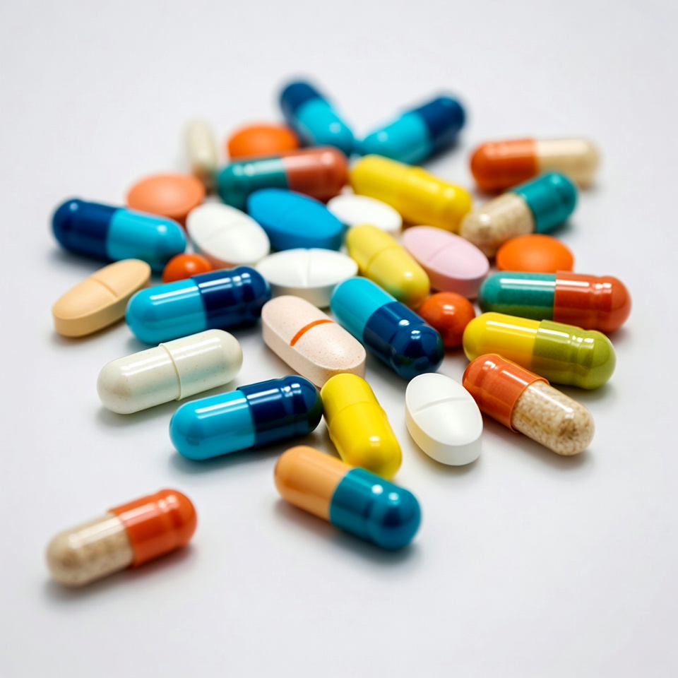 assorted medications, blue pills, capsules, colorful pills, drug pile, healthcare, medication, orange tablets, pharmacy, pink capsules, prescription drugs, supplements, tablets, vitamins, white background, white capsules, yellow pills, pills