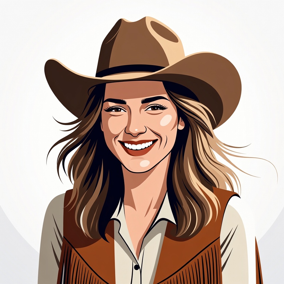 A smiling woman with long wavy brown hair wears a wide-brimmed brown cowboy hat. She has on a white collared shirt with brown leather vest featuring fringe details. The illustration is set against a white background.