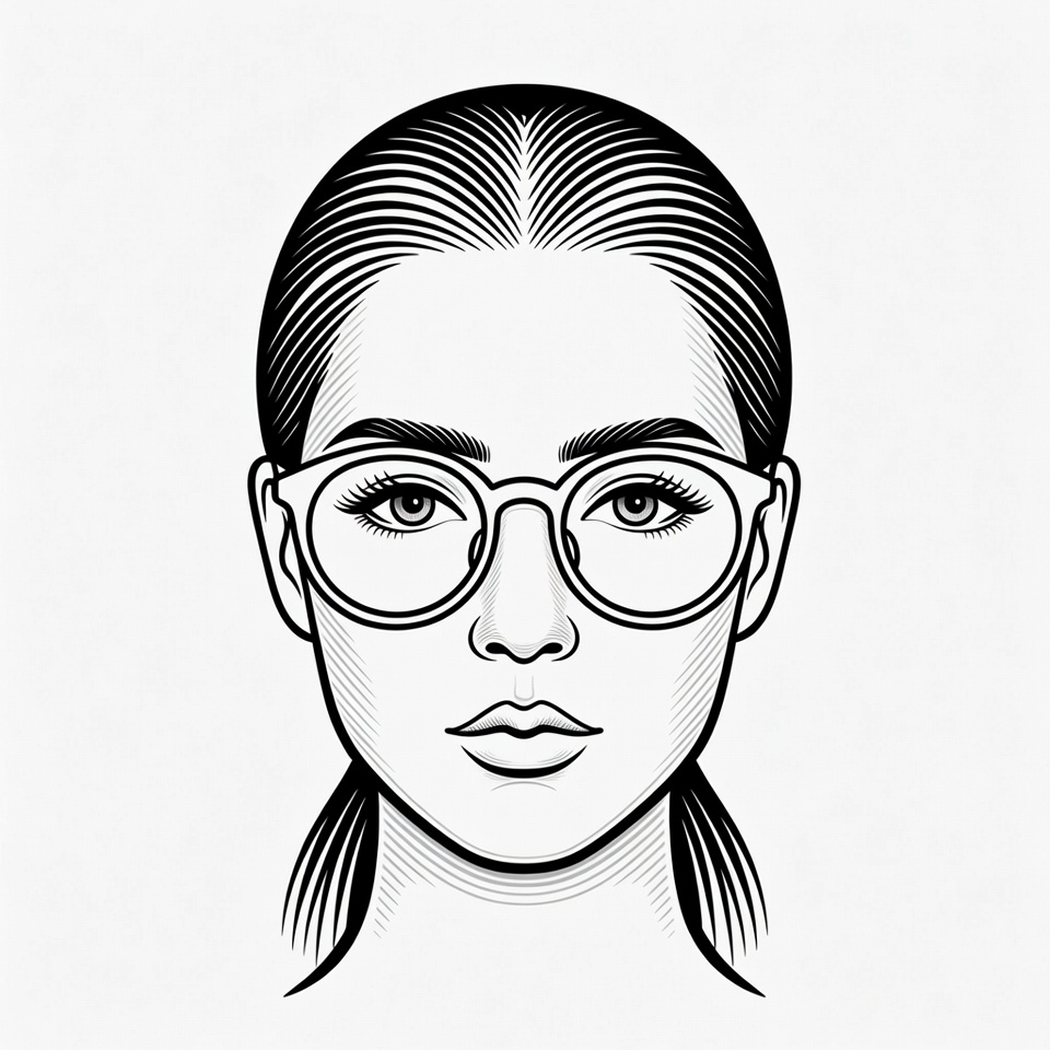 Black and white line art illustration of a woman's face with long hair pulled back. She wears round glasses with thick frames and has detailed eyelashes and lips. The portrait is centered on an isolated white background.