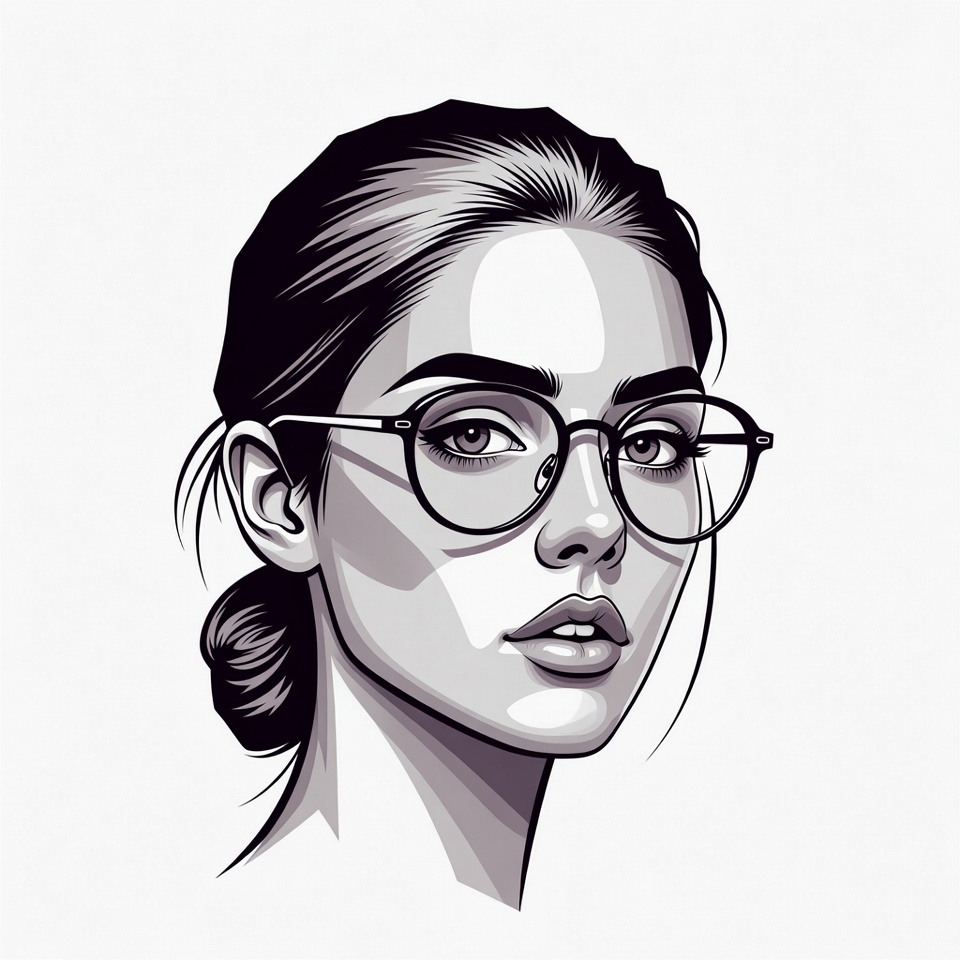 artistic portrait, attractive woman, beauty, black and white, bun hairstyle, closeup, dark hair, digital art, eyeglasses, face, female, glasses, illustration, isolated background, line art, modern woman, portrait, stylish glasses, vector art, young woman, woman