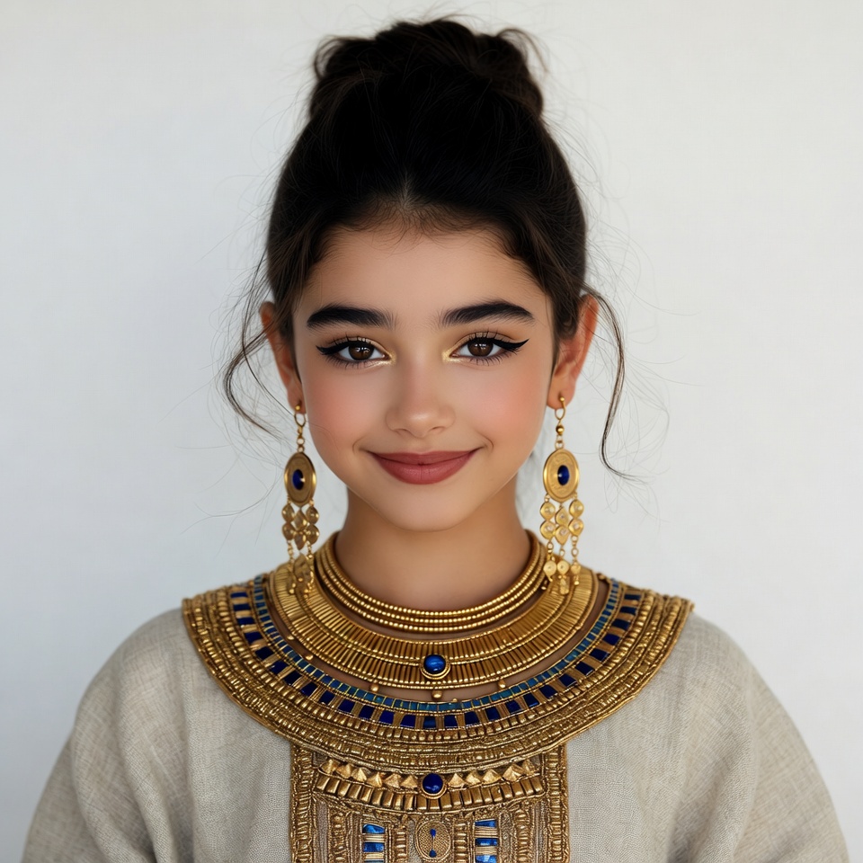 Egyptian costume, Middle Eastern, ancient Egypt, blue collar, bun hairstyle, costume, dark hair, eyeliner makeup, gold earrings, gold necklace, isolated background, jewelry, pharaoh, young girl, girl