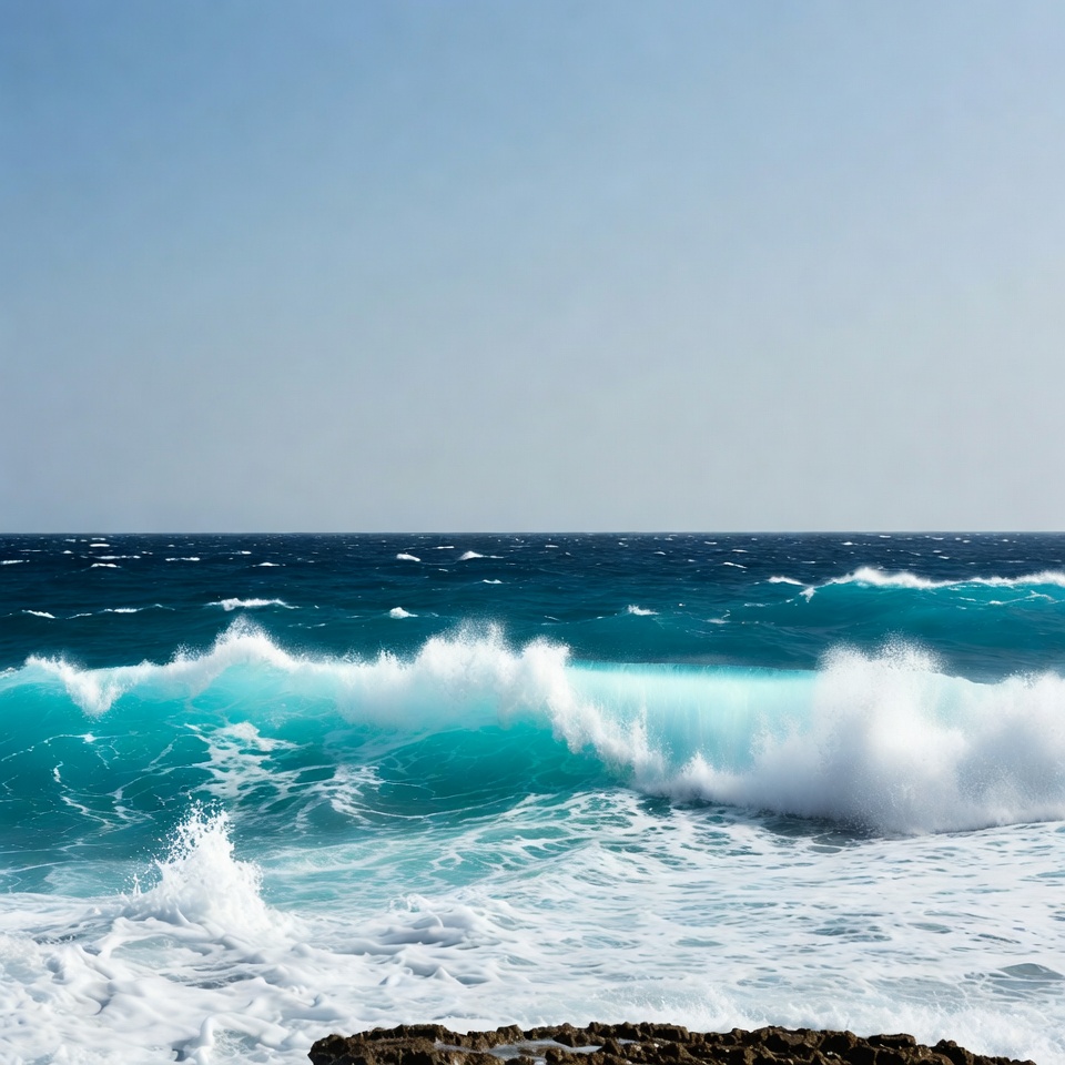 Powerful turquoise waves crash against rugged rocks under a clear blue sky. White foam sprays from the breaking surf as the ocean meets the rocky shore. The horizon stretches across the vibrant blue sea.