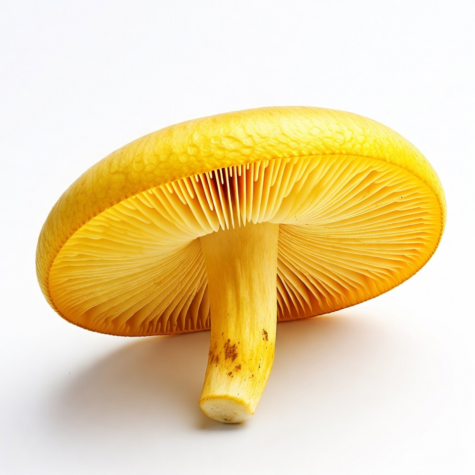 A fresh yellow mushroom with a convex cap and gills is displayed upside down on a white background. The cap features textured yellow skin, and the stem is sturdy and pale yellow. The gills radiate from the stem in neat rows.
