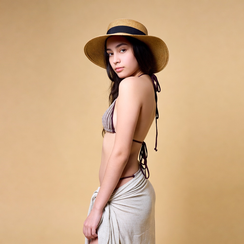 A young woman with long dark hair stands sideways wearing a brown string bikini top and bottoms. She has a beige sarong wrapped around her hips and holds it with one hand. She wears a wide-brimmed black and tan straw hat against a plain beige background.