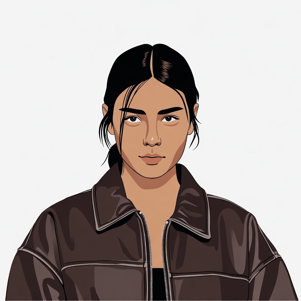 A digital illustration of a young Asian woman with straight black hair parted in the middle and subtle bangs. She wears a shiny brown leather jacket with a high collar and zipper, slightly open at the top. The portrait is set against a plain white background.