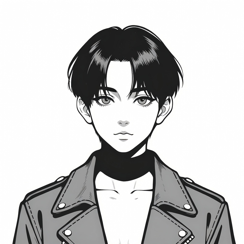 A black and white anime-style illustration of a young boy with straight black hair and large expressive eyes. He wears a detailed leather jacket with buttons and a high black collar, standing against an isolated white background. His expression is neutral with slightly parted lips.