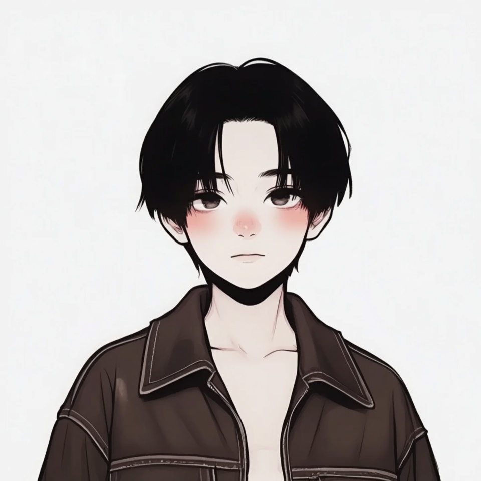 Asian, anime style, black hair, blush cheeks, boy, brown jacket, character design, collarbone, cute boy, digital art, front view, illustration, kawaii, large eyes, male, manga art, neutral expression, open jacket, portrait, straight hair, stylized face, white background, young man, anime boy
