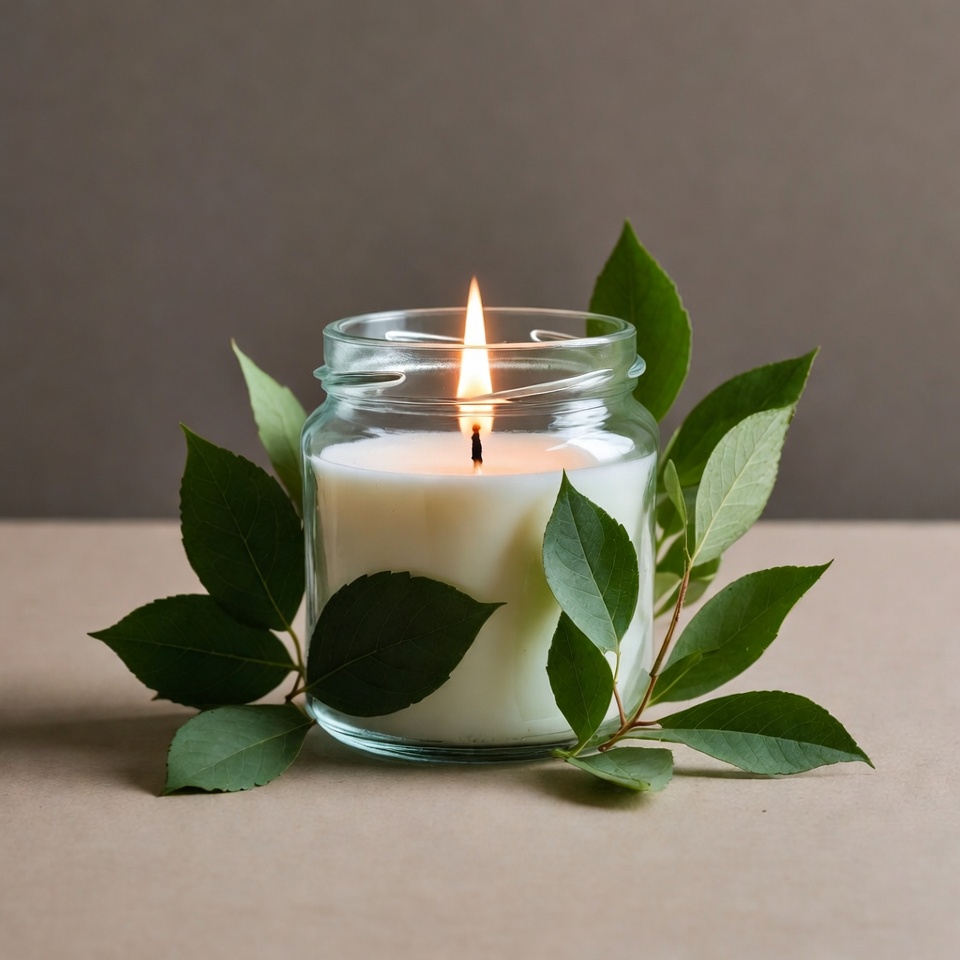 A clear glass jar candle with a bright flame sits on a neutral surface. White wax fills the jar, and fresh green leaves surround its base. The setup is isolated against a soft gray background.