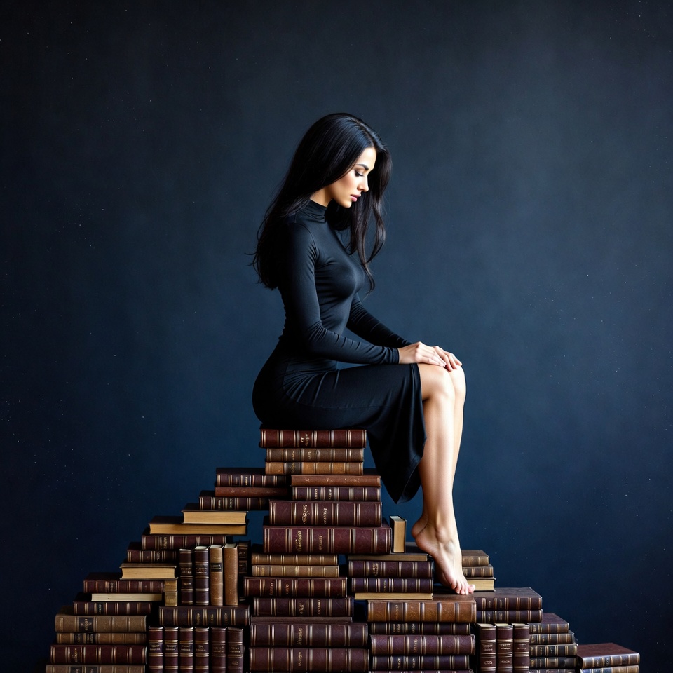 A woman with long dark hair sits elegantly on a tall stack of vintage books against a dark background. She wears a form-fitting black dress that reveals her legs and bare feet. Her pose is poised with one hand resting on her knee.