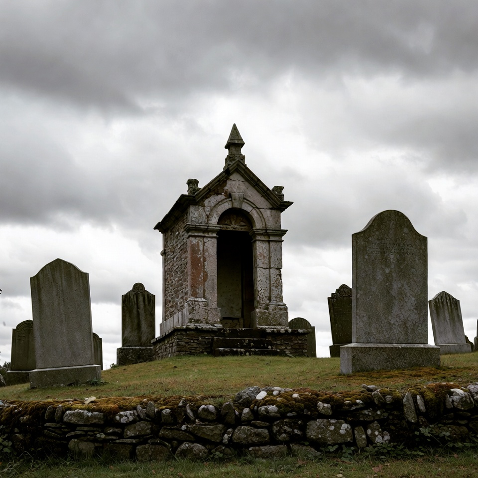 A weathered stone mausoleum with an arched entrance and pointed roof stands prominently in a grassy cemetery. Surrounding it are numerous tall, moss-covered gravestones under a dark, overcast sky. A low stone wall encircles the burial ground.