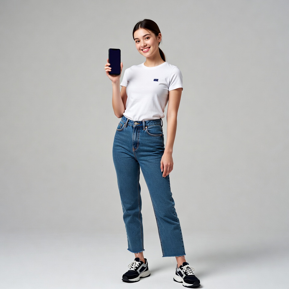 A young Asian woman with dark hair in a ponytail smiles while holding up a black smartphone in her right hand. She wears a white short-sleeve t-shirt, light blue high-waisted jeans, and black sneakers, standing against a plain gray background. Her pose is confident with one hand on her hip.