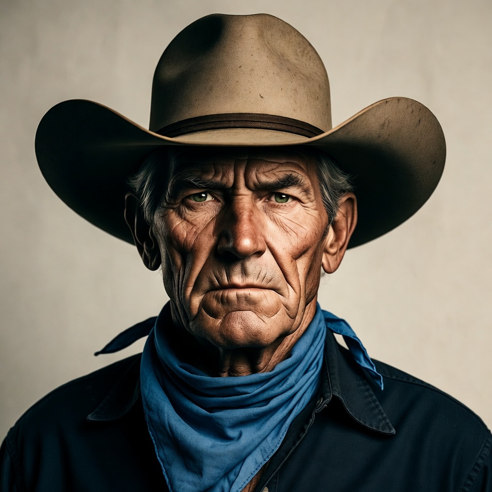 An elderly man with a weathered face stares directly at the camera. He wears a wide-brimmed tan cowboy hat, a blue bandana around his neck, and a dark shirt. The image features a neutral background, highlighting his stern expression and traditional Western attire.