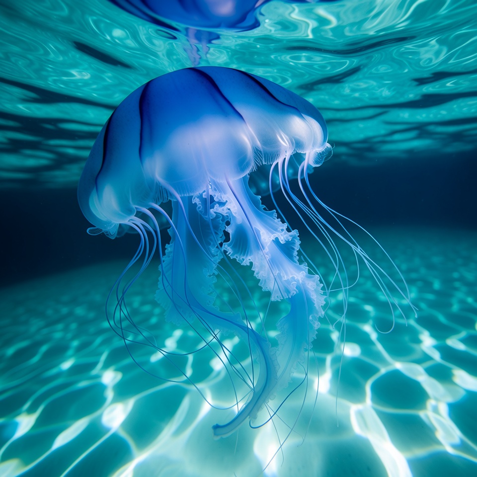 A translucent blue jellyfish with long trailing tentacles floats gracefully in clear ocean water. Its bell is striped in dark blue and glows softly against the turquoise underwater background. Rippling light patterns illuminate the surrounding water.