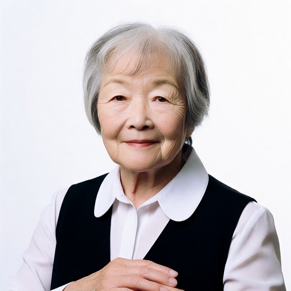 An elderly Asian woman with short gray hair smiles gently at the camera. She wears a white collared shirt under a black vest and clasps her hands together. The image is set against a plain white background.
