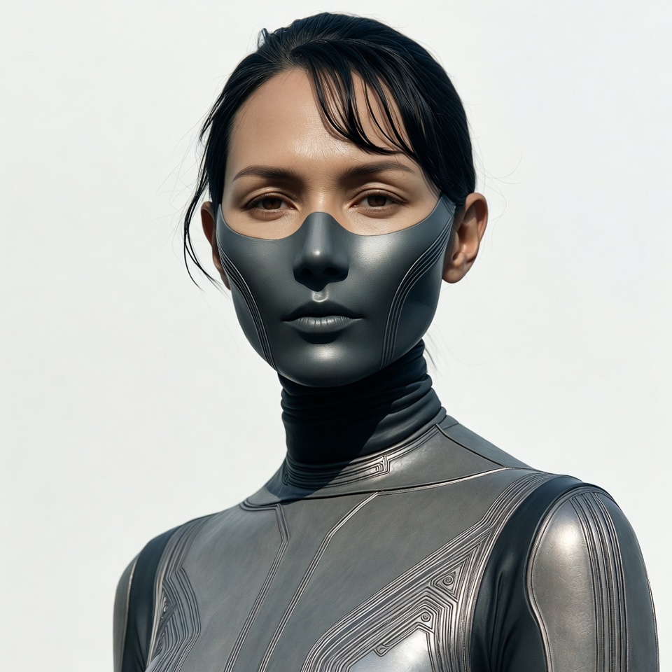 Asian, armor suit, black hair, bodysuit, cyberpunk, dystopian, face mask, female, futuristic, glossy material, gray outfit, headshot, high collar, isolated background, mask, metallic clothing, modern fashion, portrait, sci-fi, silver suit, sleek design, white background, young woman, woman