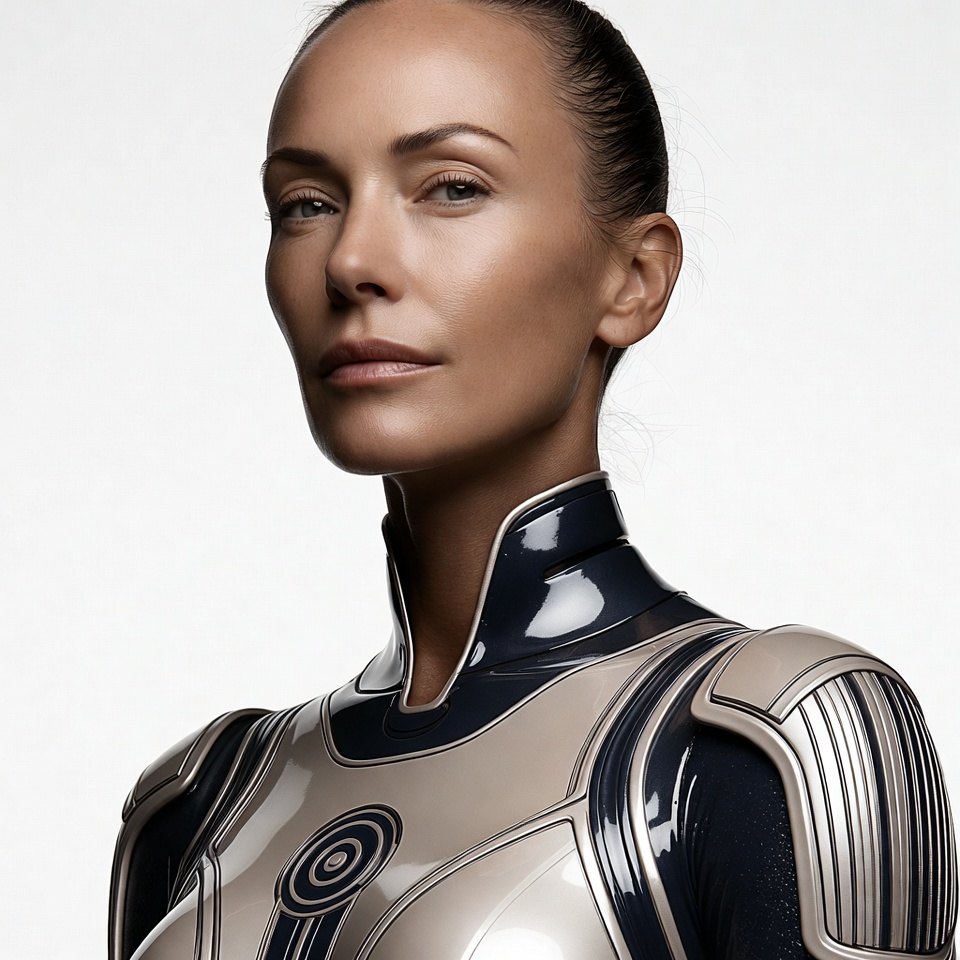 A woman with sleek dark hair pulled back poses confidently against a white background. She wears a high-collared futuristic armor suit in metallic silver and navy blue with glossy panels and circular designs. Her expression is intense with direct gaze at the viewer.