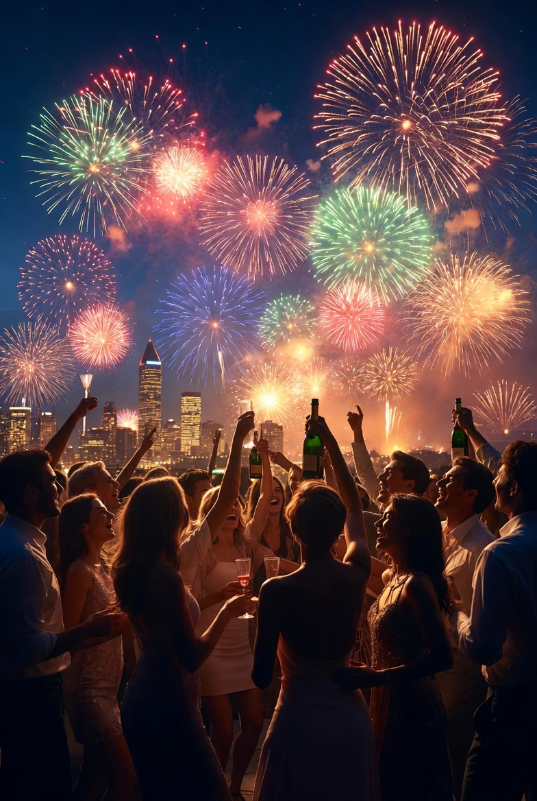 A diverse crowd of men and women in elegant evening attire raises champagne glasses and bottles in celebration. Vibrant multicolored fireworks explode in the night sky above a city skyline with tall skyscrapers. The group stands silhouetted against the brilliant display of lights.