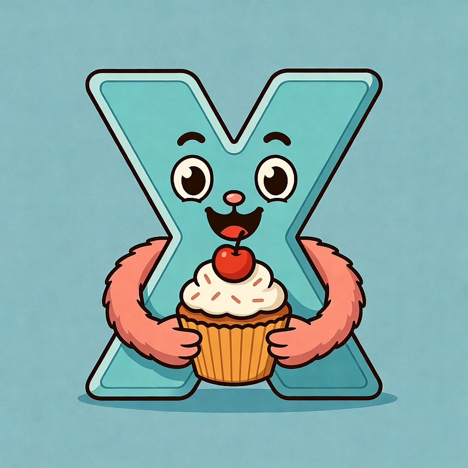 A cute cartoon blue letter X with happy eyes, smiling mouth, and pink furry arms holds a cherry-topped cupcake. The X has a glossy outline and stands on an isolated light blue background. The illustration features vibrant colors and a playful design.