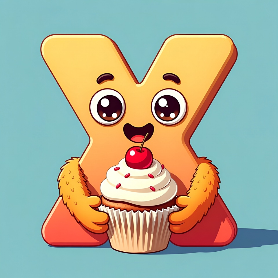 A vibrant cartoon letter X with big expressive eyes, a smiling mouth, and orange furry arms holds a white cupcake topped with red cherry and cream. The character stands on a light blue background. The design features bold outlines and playful styling.