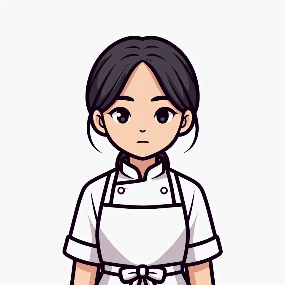 A cartoon Asian woman with black hair tied back stands wearing a white chef uniform and apron. She has large expressive eyes and a neutral expression on a plain white background. The illustration features clean lines and a chibi style.