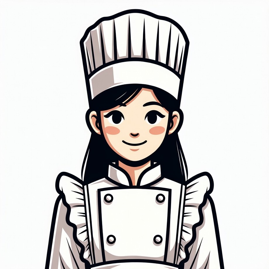 Asian girl, anime chef, cartoon chef, chef character, chef uniform, clipart, cute chef, female chef, frilly uniform, illustration, isolated background, kitchen chef, long black hair, manga style, ruffled sleeves, smiling girl, white chef hat, white uniform, young woman, chef girl