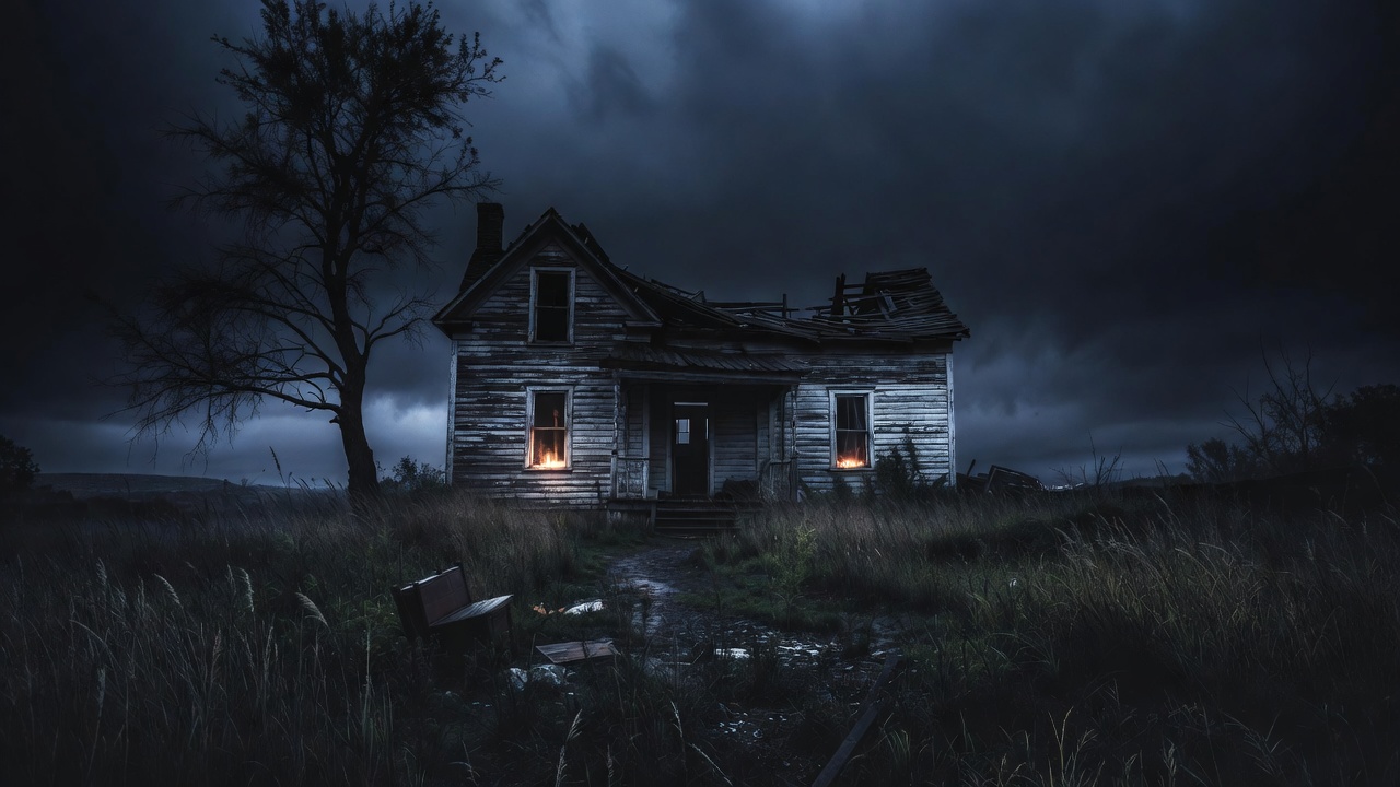 barren tree, clouds, creepy house, dark atmosphere, decay, dilapidated building, eerie light, foggy landscape, front view, glowing windows, haunted house, horror house, isolated house, night scene, old house, outdoor, overgrown yard, porch, ruins, rural setting, spooky mansion, stormy sky, tall grass, twilight, weathered wood, wooden house, abandoned house