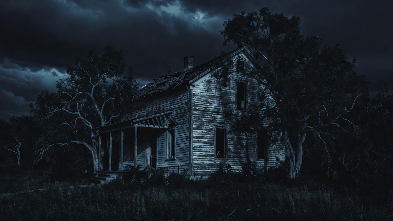 abandoned building, bare trees, broken windows, creepy house, dark clouds, dark forest, dilapidated building, eerie atmosphere, ghost house, haunted house, horror scene, isolated house, moonlight, night scene, old house, ominous sky, overgrown yard, peeling paint, porch, rural decay, spooky landscape, stormy sky, tall grass, weathered wood, wooden house, abandoned house