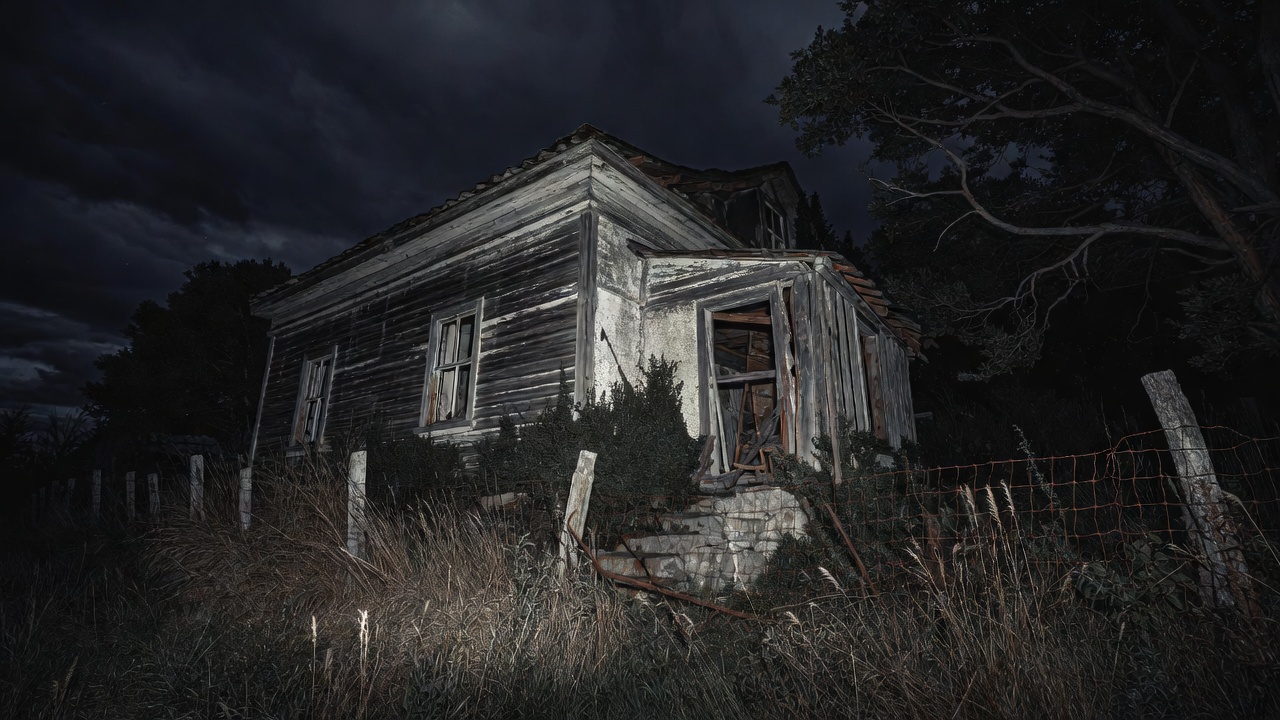 A dilapidated wooden house stands abandoned in tall grass under a dark night sky. The structure features peeling white paint, broken windows, and a sagging porch surrounded by a rusted wire fence. Overhanging trees and overgrown weeds enhance the eerie, isolated atmosphere.
