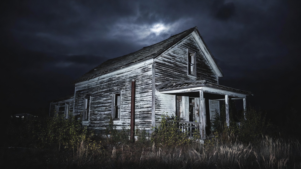 A dilapidated white wooden house stands in tall grass under a dark stormy sky with a visible moon. The structure features weathered siding, broken windows, and a sagging front porch overgrown with weeds. Dim lighting casts eerie shadows around the isolated building.